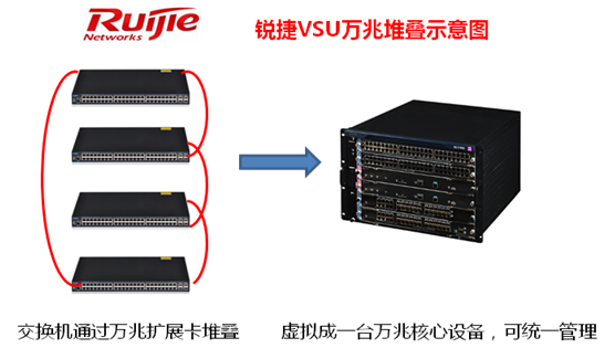 支持VSU(Virtual Switch Unit)即虚拟交换单元技术。通过聚合链路连接,将多台物理设备虚拟为一台逻辑上统一的设备,使其能够实现统一的运行,利用单一IP地址、单一Telnet进程、单一命令行接口(CLI)、自动版本检查、自动配置等特性简化了管理。