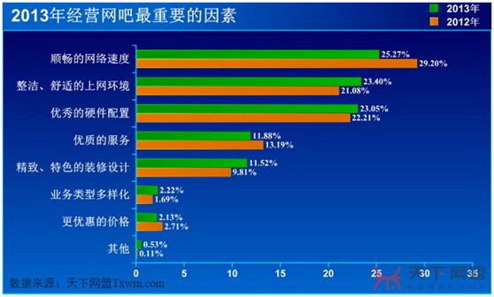 在网吧市场竞争日益激烈的今天,如何吸引网吧的客户成为网吧业主所必需思考的一个生存问题。是提供更低的价格,还是提供更好的装修环境,或是更换最好的PC显示器,还是提供最好的鼠标键盘。调查显示,去网吧上网的人群,最关心的4个问题依次是:顺畅的网络速度、整洁舒适的上网环境,然后才是高端的硬件配置以及优质的服务。可见,流畅的网络速度是还是网吧最吸引客户的最重要的武器之一和生存的根本。下图为2013年对比2012调查结果(2014暂未显示具体数据)