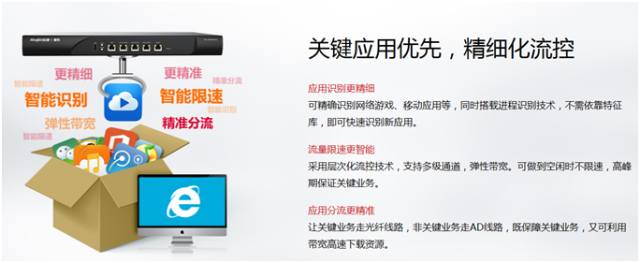 新一代流控网关,,5千兆电口(其中4个LAN口可更改为WAN口),最大处理带宽200M,支持多线路接入,应用分流,中文WEB页面一分钟完成配置,精准识别P2P下载、网络视频、聊天软件等上千种应用特征,将识别率从业界平均水平80%提升至95%以上,流控特征库永久免费升级 |