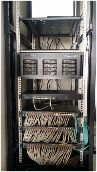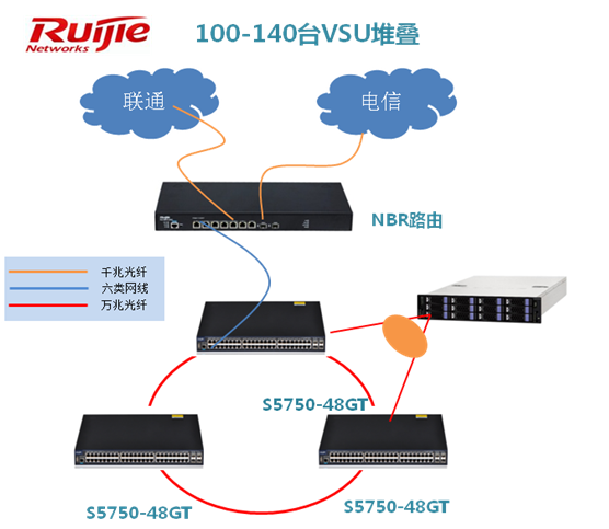 机房布线网络,全部集中布线到机房,4台锐捷S5750-48堆叠,双万兆汇聚到服务器
